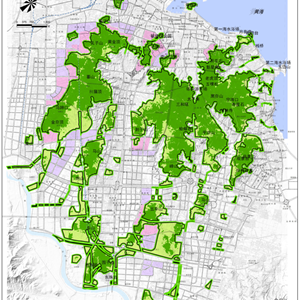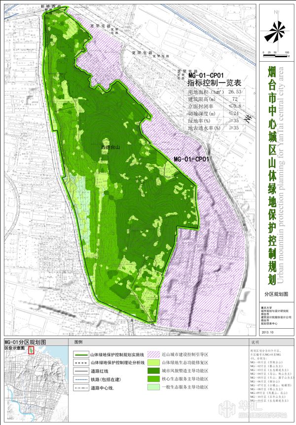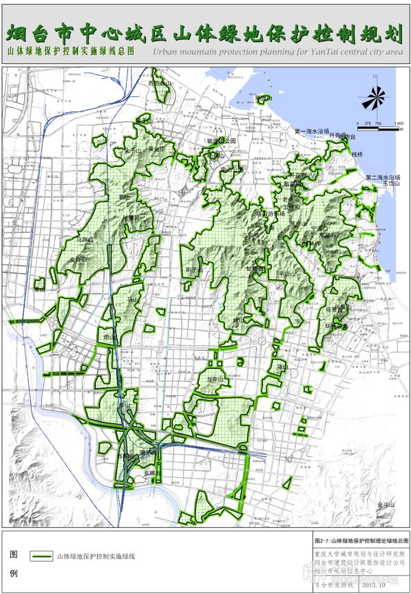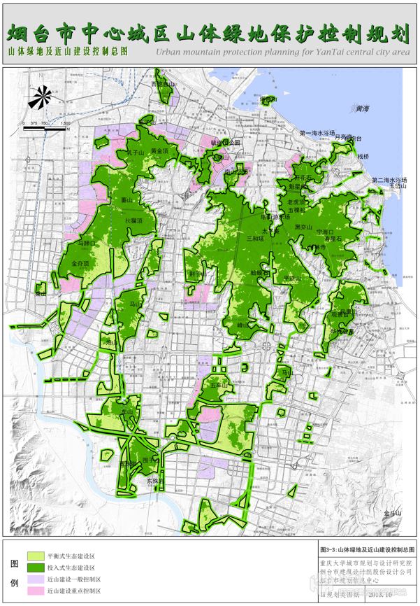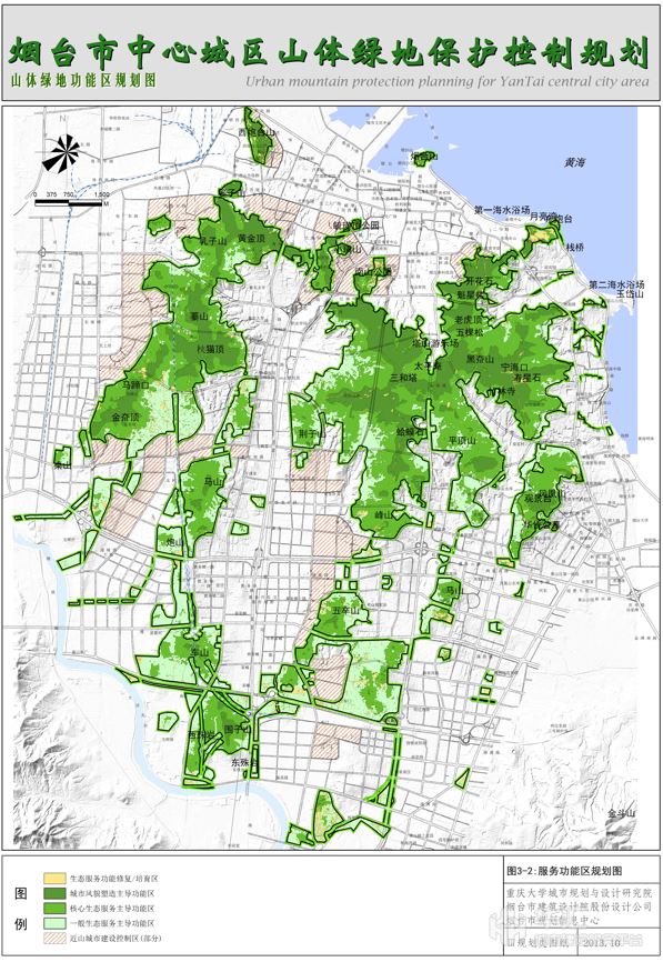 本項目以煙臺市中心城區(qū)蓁山、塔山、岱王山及周邊約60平方公里山體為規(guī)劃對象,兼顧約10平方公里的近山建設用地。綜合應用地理信息系統(tǒng)(GIS)、衛(wèi)星遙感(RS)技術,提出城市山體保護控制綠線的數(shù)量化識別方法,構(gòu)建山體綠線及近山建設用地管控的數(shù)量化指標體系、制定系統(tǒng)化山地綠線管控圖則、設計山體綠線管理實施詳案。