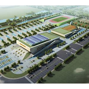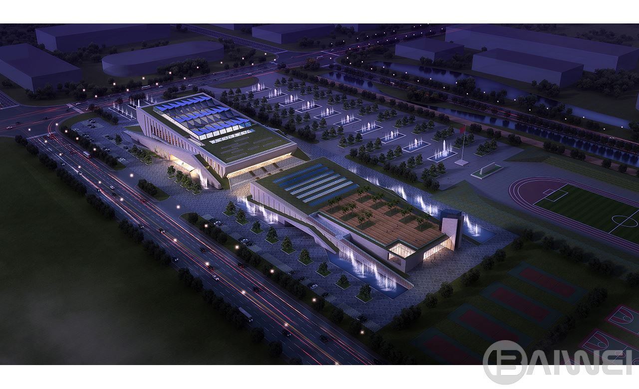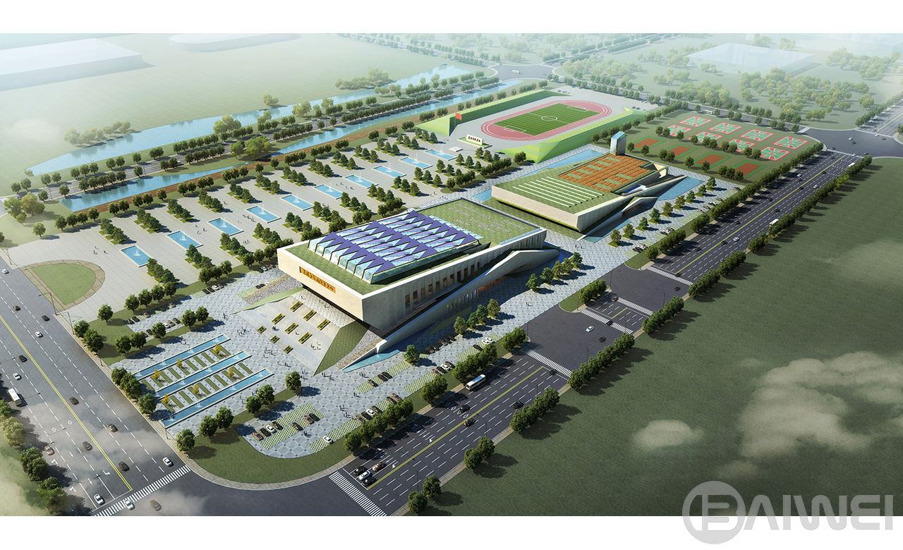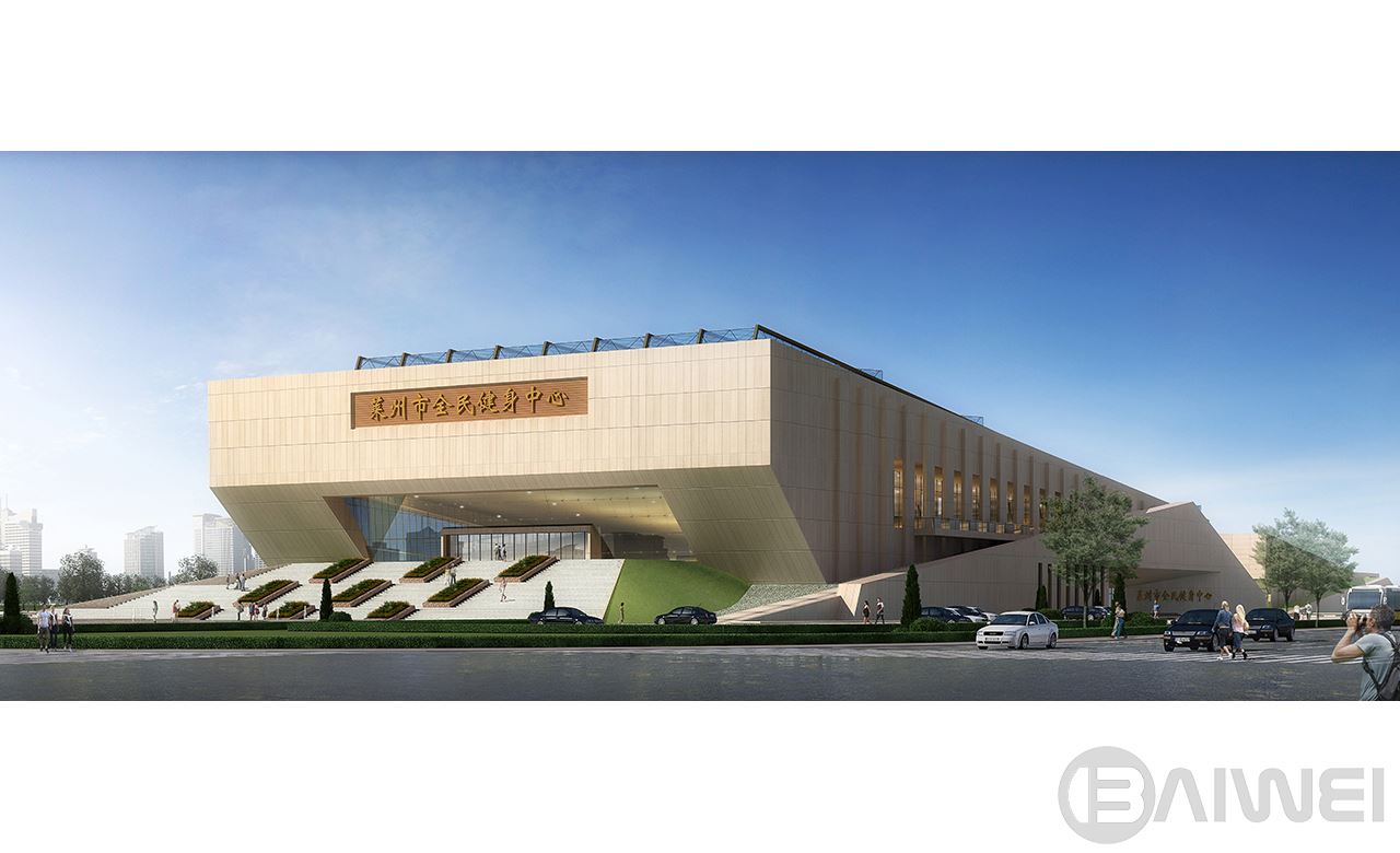 “靈石合出,福澤東萊”。本方案以:“靈石合出接祥瑞,全民健身福東萊”為設(shè)計主題,以彰顯萊州特色的山石文化。通過交匯而出的兩個石塊形成建筑基本體量,輔以流暢的線條和當(dāng)?shù)靥禺a(chǎn)的石材,打造出渾然天成又極具萊州特色的全民健身場所。建筑順應(yīng)地形,采用南北向矩形布局。同時根據(jù)用地周邊道路情況分別在場地南側(cè)的北苑路設(shè)置禮儀性人行主入口;東側(cè)的東嶺路設(shè)置機(jī)動車出入口 。考慮到體育場館使用上的特點,地面停車的方式更為方便,停車場沿場館周邊分散式布置。平面功能以主體育館為中心,周邊配以輔助空間,其中觀眾、賽事組織、運(yùn)動員、貴賓、辦公人員等均有其單獨(dú)的入口,以達(dá)到分區(qū)明確,流線清晰,互補(bǔ)干擾的設(shè)計目的。同時訓(xùn)練館與主體育館之間設(shè)置采光中庭,不但作為空間過度,豐富了內(nèi)部空間同時還解決了大進(jìn)深帶來的采光問題。