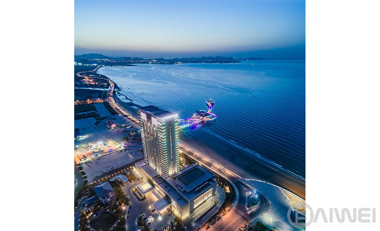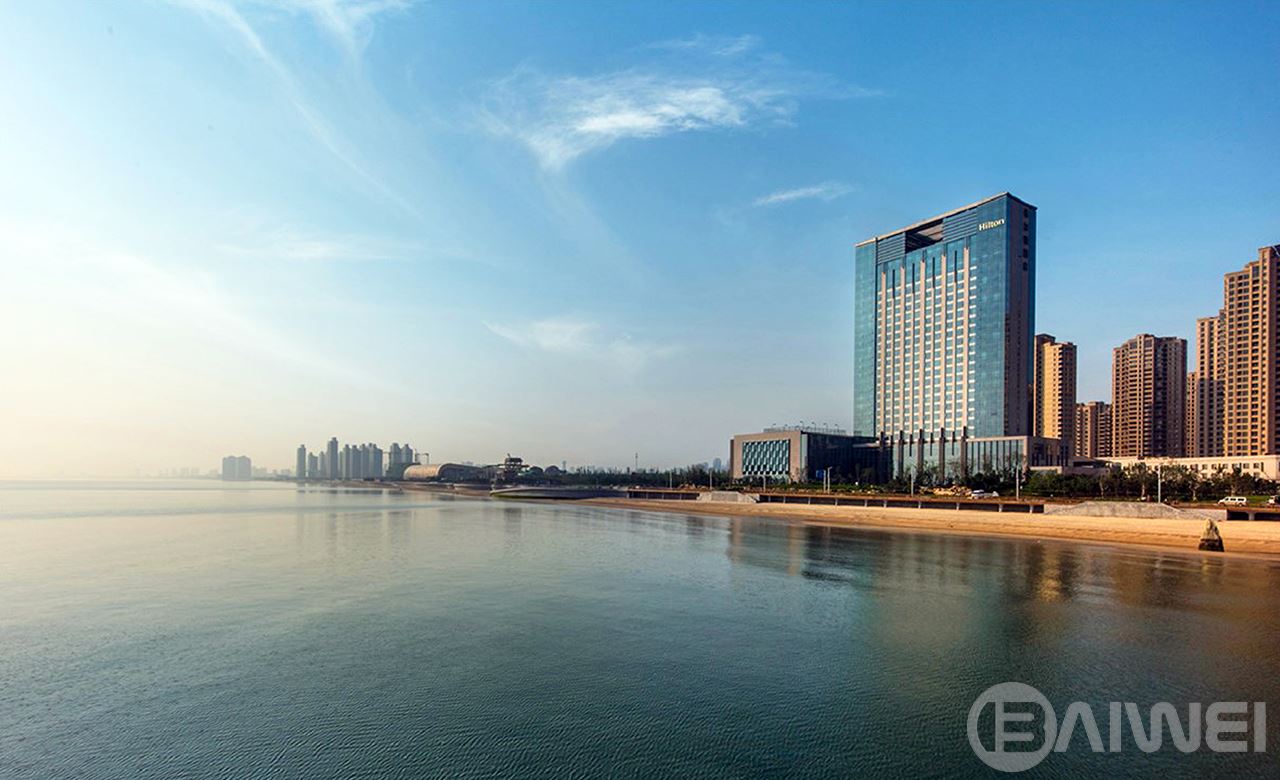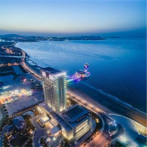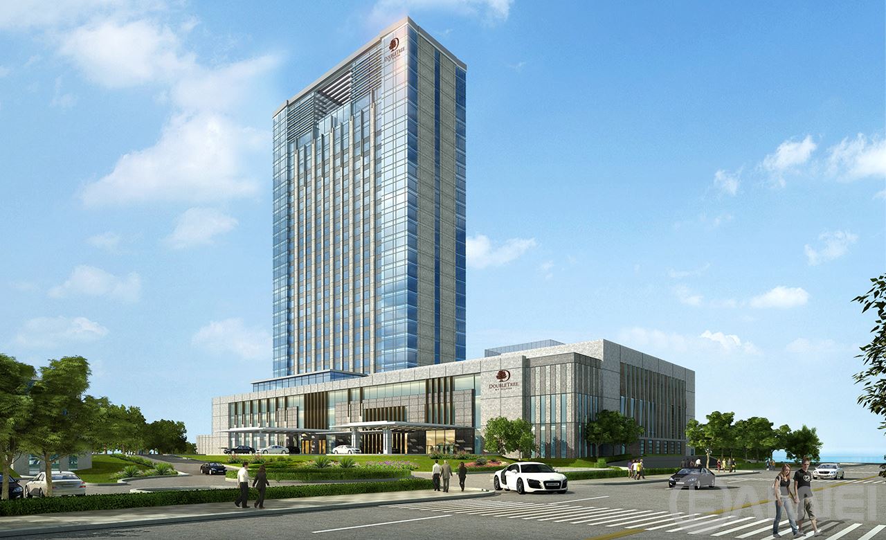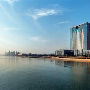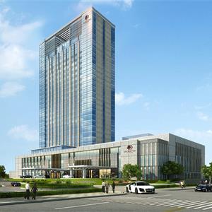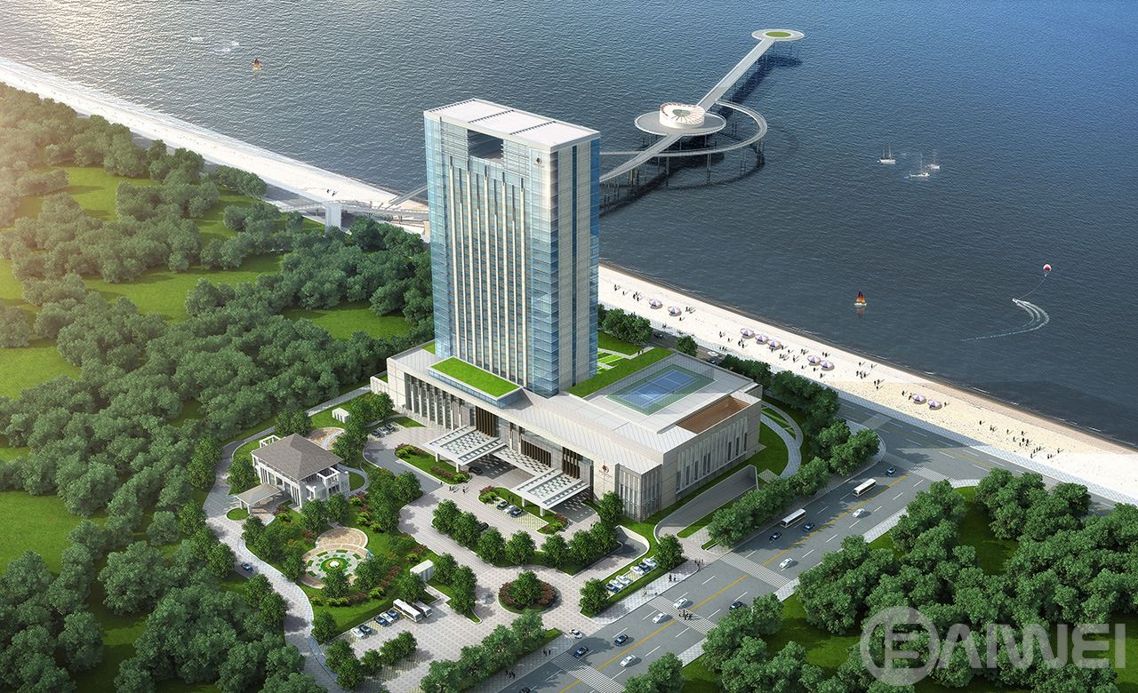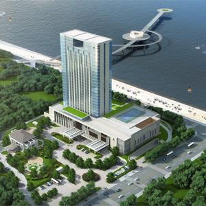建筑地下一層、地上24層,由位于用地中央的酒店高層塔樓和南側(cè)及東側(cè)的4層裙房的宴會(huì)廳樓這兩部分組成。設(shè)計(jì)以“起點(diǎn)”----“入口”為出發(fā)點(diǎn),“入口”既有“大門”的意思,也意味著所有事物的起點(diǎn)和進(jìn)入口。酒店塔樓便是以“入口”為印象,塔樓兩側(cè)的幕墻部分的縱向線條和塔樓頂層中央部位的開口部分相得益彰,呈現(xiàn)出一個(gè)生機(jī)勃勃的“入口”。另外,裙房里面以及宴會(huì)廳樓外墻構(gòu)成也體現(xiàn)了“入口”這一概念。為客人營(yíng)造出一種“歡迎光臨”的氛圍。從位于用地東側(cè)的寧波路可以進(jìn)入到酒店,在建筑南側(cè)設(shè)置了停車門廊。北側(cè)的花園可有效緩沖北風(fēng)的吹襲,南側(cè)花園設(shè)計(jì)成豐茂的綠地景觀。通過(guò)酒店塔樓與海岸線平行設(shè)置,使得靠海一側(cè)的客房可以欣賞到海景,靠陸地一側(cè)的客房可以欣賞到城市景觀。