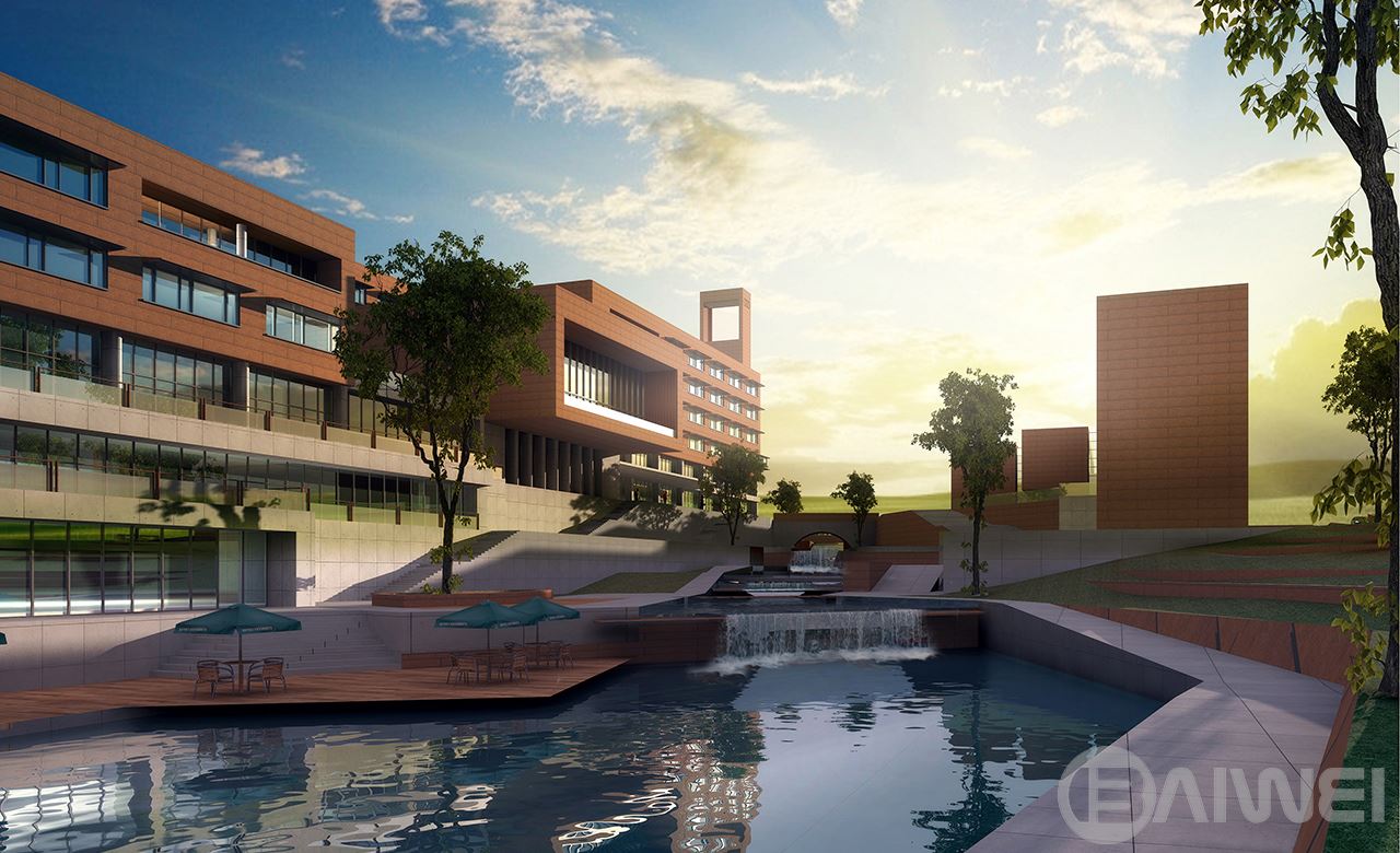 項(xiàng)目包括四部分內(nèi)容:綜合樓,重工業(yè)廠(chǎng)房,宿舍樓和一座鎖文化博物館。設(shè)計(jì)中始終以“自然”為基準(zhǔn)點(diǎn),追求實(shí)用的舒適度及品味,同時(shí)建立區(qū)域的獨(dú)立性,將“自然與人文”貫穿于設(shè)計(jì)的全過(guò)程。地塊北段較為平坦,南側(cè)有自然溝壑,東西有11米高差。建筑依地勢(shì)建造,將除了博物館以外的內(nèi)容布置在相對(duì)平坦的北部,一條貫穿東西的道路聯(lián)系各部分功能。博物館則建設(shè)在地塊的東南角,直接對(duì)城市開(kāi)放。在博物館和綜合樓之間的自然溝壑處建設(shè)景觀帶,其間有水流順勢(shì)而下。景觀給園區(qū)內(nèi)人員提供觀賞與休憩場(chǎng)地。南側(cè)道路上的往來(lái)行人,因?yàn)楦糁坝^觀賞建筑,建筑和景色互為增色。立面造型體量簡(jiǎn)潔,強(qiáng)調(diào)建筑的雕塑感,突出建筑水平線(xiàn)條與垂直線(xiàn)條的交叉,完善體量的同時(shí)又強(qiáng)調(diào)出建筑的高聳型態(tài);以塊面的構(gòu)成與開(kāi)窗的形式強(qiáng)調(diào)建筑的幾何美感,并通過(guò)材料的質(zhì)感和顏色的無(wú)變化,使整個(gè)建筑生長(zhǎng)于自然。