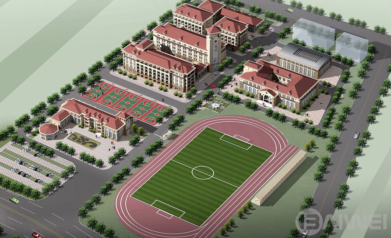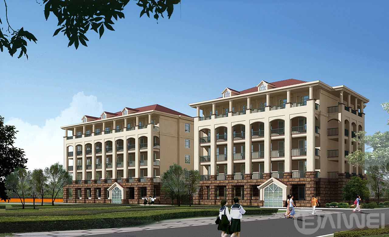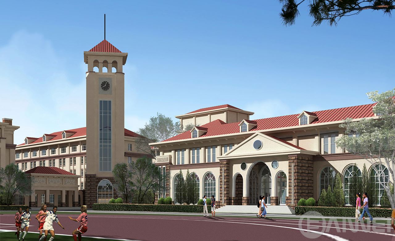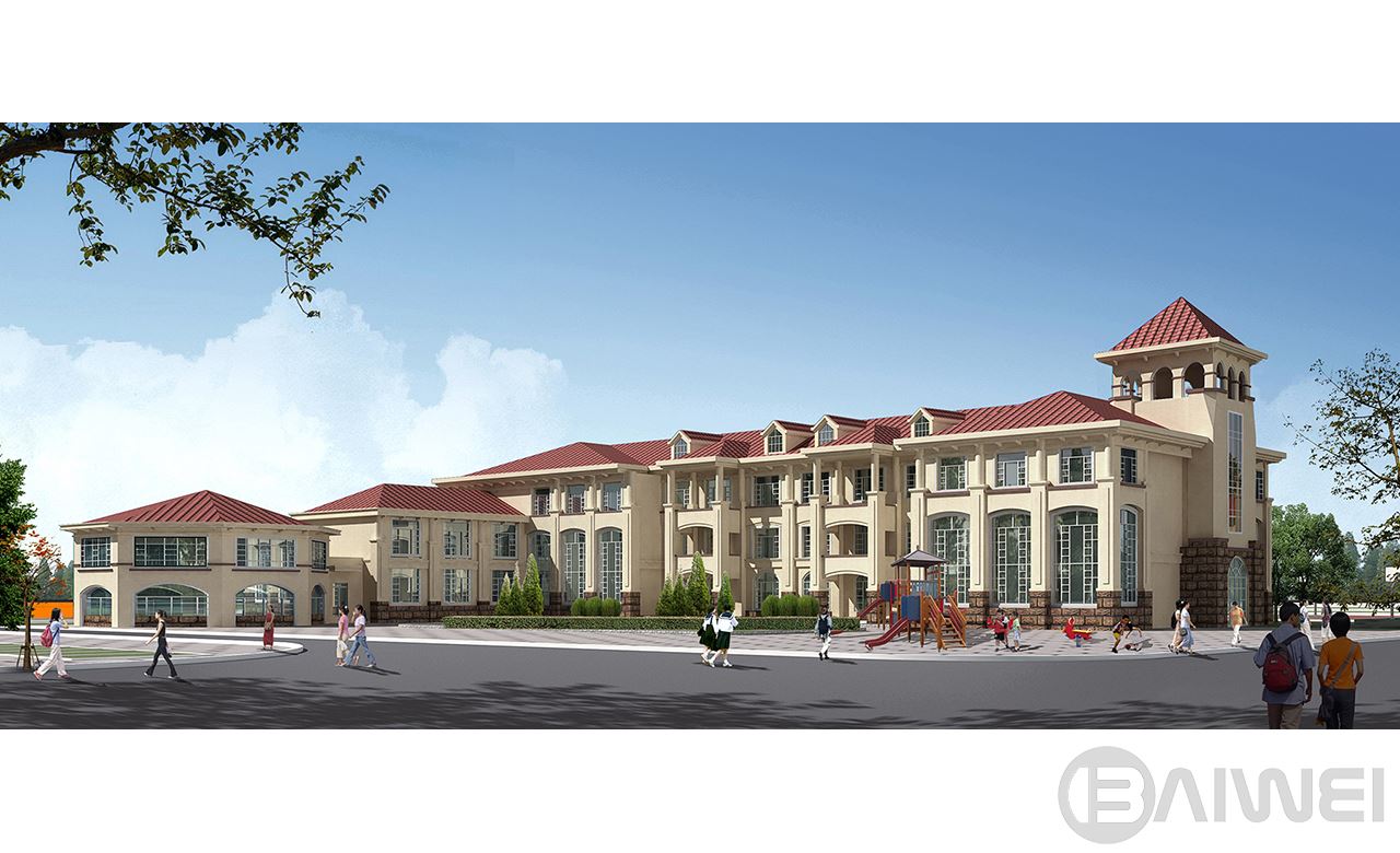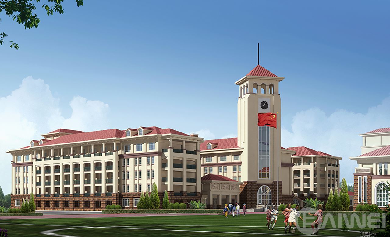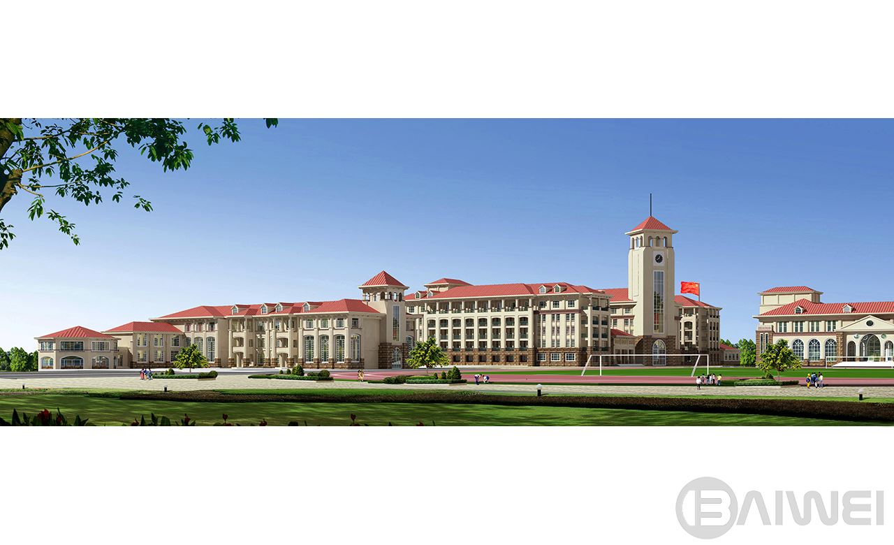 項目位于煙臺市萊山區(qū),共包括中學教學樓,辦公樓,小學教學樓,活動中心,學生宿舍兩棟,餐廳,風雨操場,教室單身宿舍兩棟。學校共42個班,其中小學18個班,中學24個班。建筑整體采用歐式風格,整個建筑群高低錯落,層次分明,以辦公樓鐘樓作為建筑群制高點,統(tǒng)領(lǐng)整個建筑群。建筑以乳白色色調(diào)為主,搭配適度褐色。建筑構(gòu)件、細節(jié)豐富,給在校師生創(chuàng)造一個舒適積極的教學學習環(huán)境。