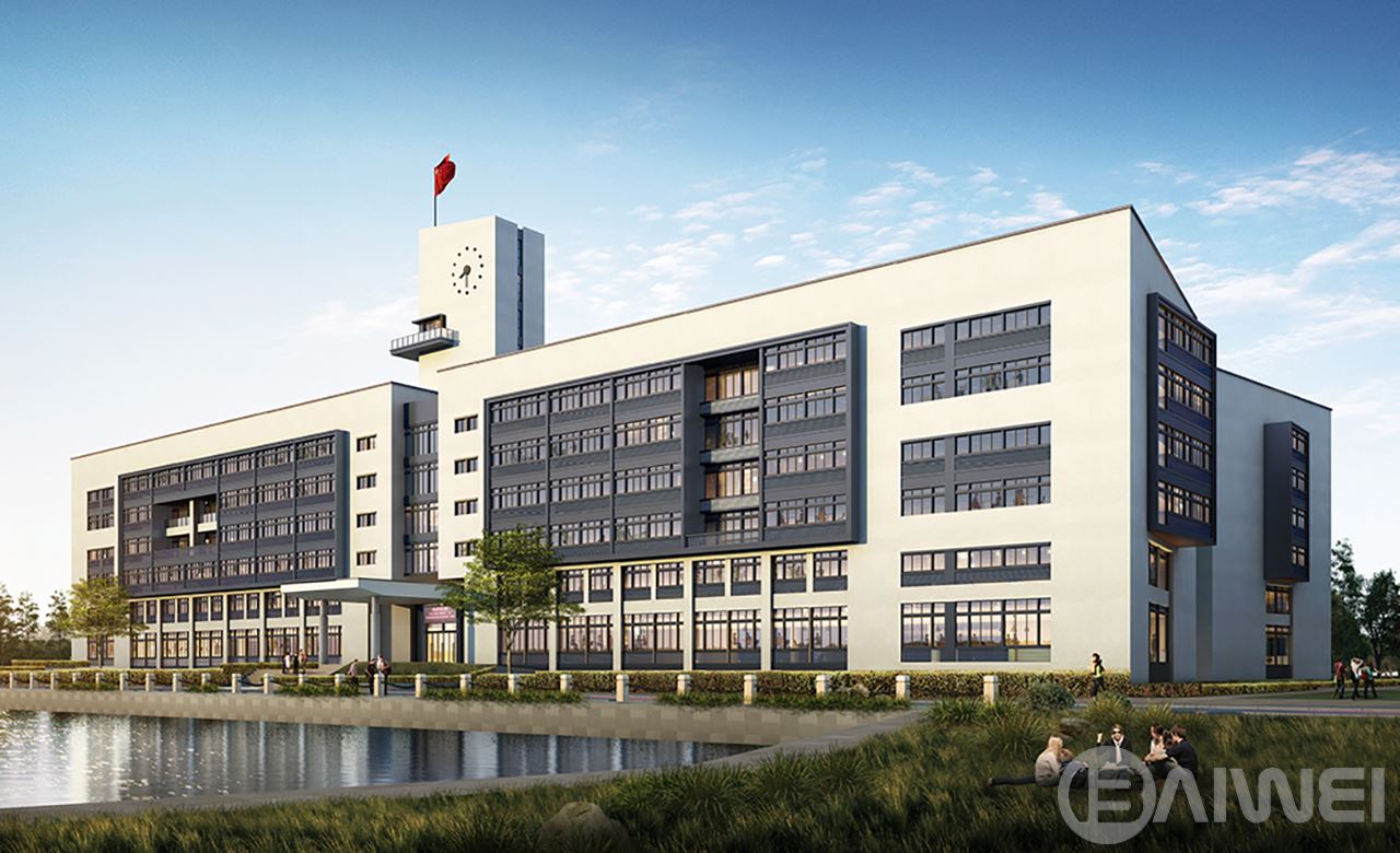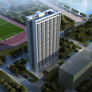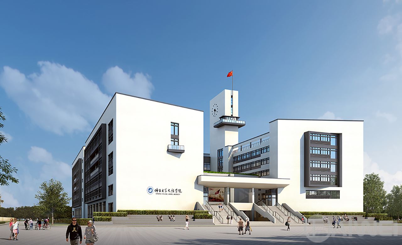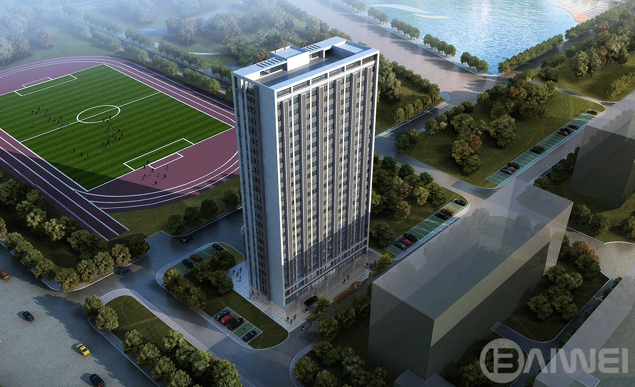 項目位于煙臺市萊山區(qū)港城東大街,包括擬新建3#教學樓與學生宿舍。建筑形體上采用保溫節(jié)能效果優(yōu)越的長方體造型,墻面規(guī)整整潔,盡量減少形體凹凸帶來的外墻面積的增加,降低主動能耗節(jié)能減排的綠色建筑。接近黃金分割比例的長邊與短邊比例,二十二層的高度視覺效果極佳。立面舒緩的多層體量強調水平線條,深色金屬質感的凸窗與淺白色外墻產生強烈的視覺沖擊力,體現理性、沉穩(wěn),同時又不失現代、激情的一面。建筑中部的高聳的鐘樓,象征蒸蒸日上的精神。更好的突出了年輕人的生活狀態(tài),激發(fā)莘莘學子的學習熱情,完美的詮釋了E時代的大學校園生活。