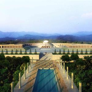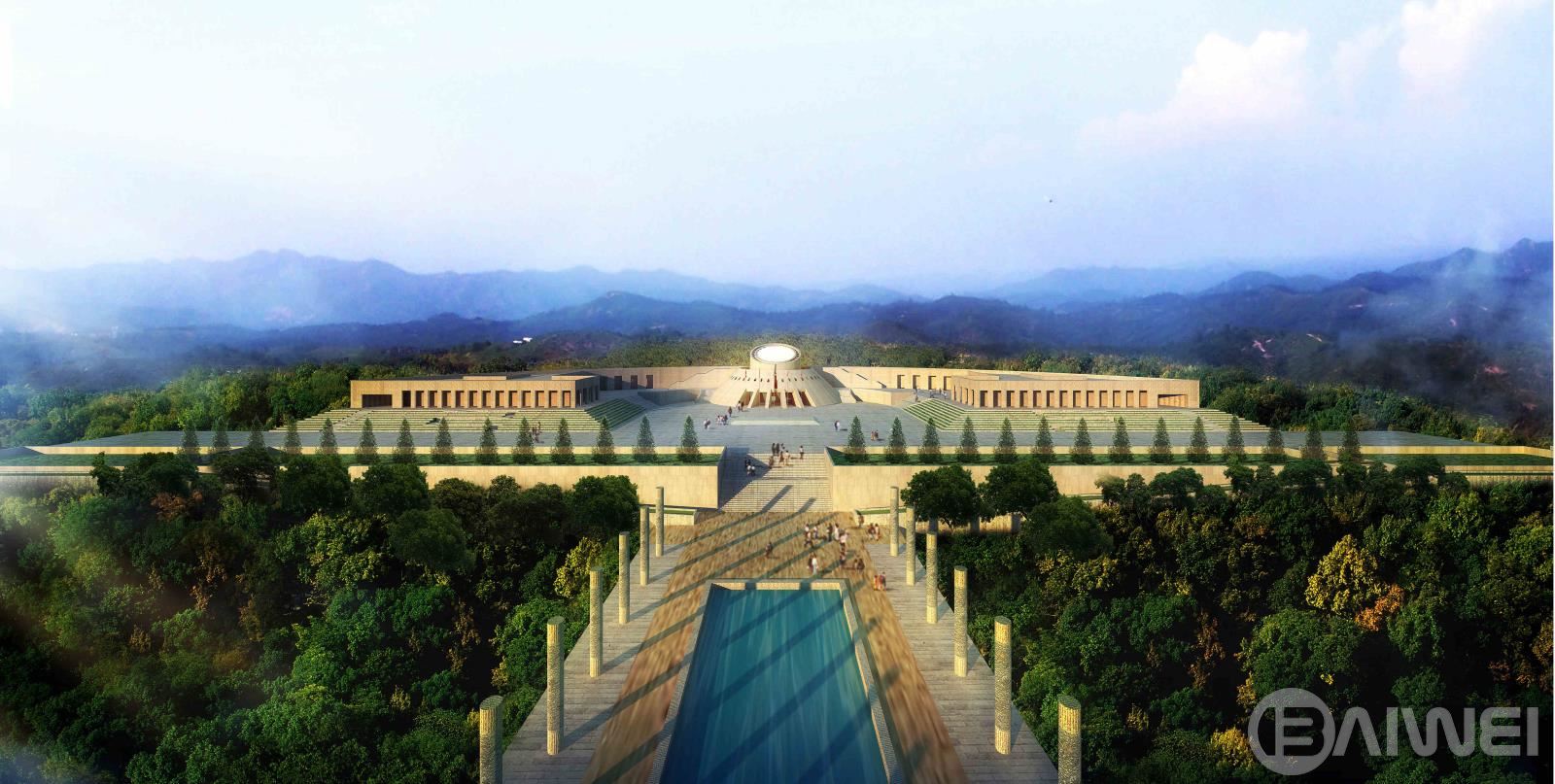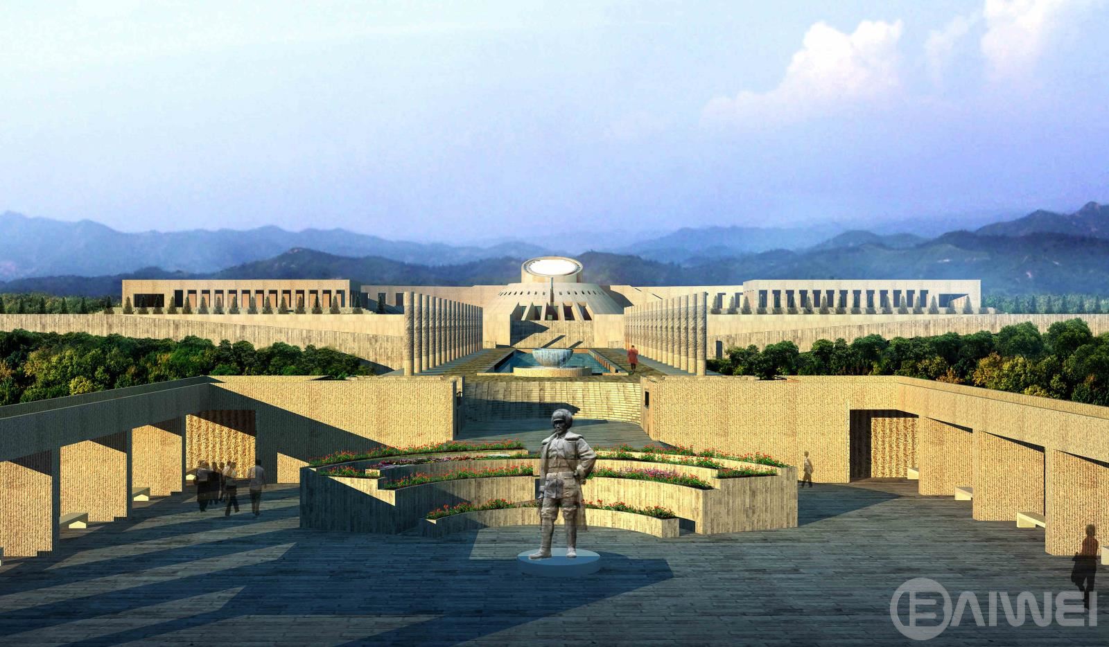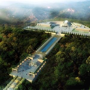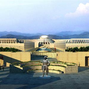 本項目設計吸收了國內外陵園建筑和祭祀建筑的可借鑒的因素,把設計的重點放在軸線,序列和節(jié)奏的變化上。主要的軸線 安排在現(xiàn)有的通向紀念碑的五百米長的道路的位置上,依次展開入口廣場—追思大道—楊子榮廣場—思源之路—紀念廣場 —紀念館4觀景臺4紀念林4烈士墓等內容。