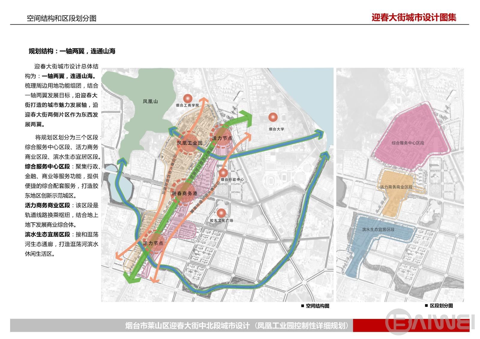 迎春大街位于煙臺市萊山區(qū)北部城區(qū)中心地段,北起觀海路,南至軫大路,全長約3.5公里。本次范圍約2.5平方公里,其中鳳凰工業(yè)園約1.1平方公里。本項目為突出迎春大街作為萊山區(qū)主要商業(yè)商務(wù)發(fā)展軸線所承載的功能和地位,推進山東省新舊動能轉(zhuǎn)換,加快鳳凰工業(yè)園區(qū)改造提升,從街道交通整治、形象提升、生態(tài)修補三個方面出發(fā),分別提出相應(yīng)的設(shè)計策略,對迎春大街(鳳凰工業(yè)園)風貌進行改造提升。形成“一軸兩翼、聯(lián)通山?!钡囊?guī)劃結(jié)構(gòu),劃分綜合服務(wù)中心區(qū)、活力商務(wù)商業(yè)區(qū)、濱水生態(tài)宜居區(qū)三個區(qū)段。并針對每個區(qū)段土地利用規(guī)劃、建筑高度和開發(fā)強度等提出控制要求。